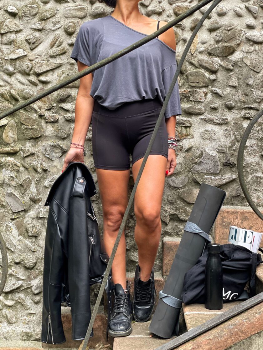 Per gli outfit fuori dal tappetino puoฬ essere abbinato a shorts o pantaloni leggermente a vita alta.