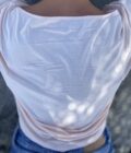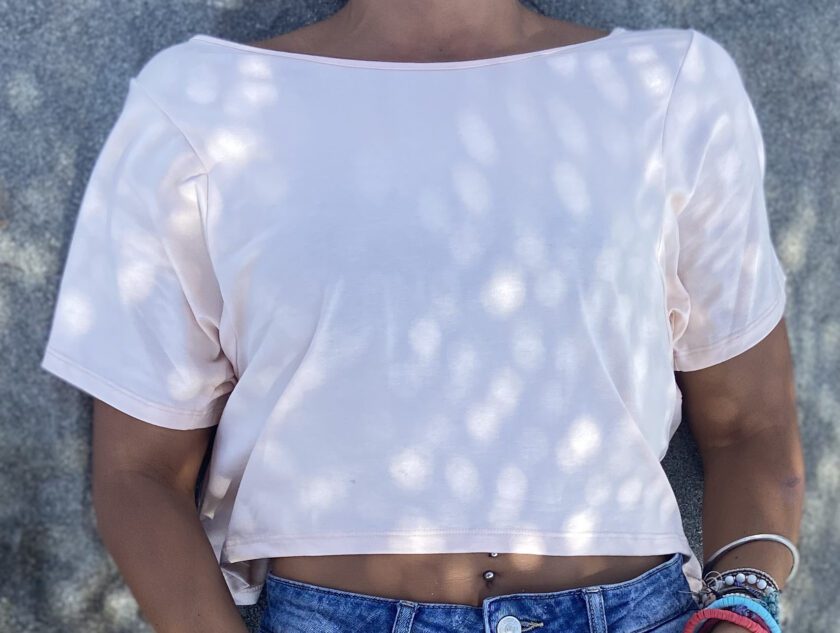 Dettagli: Modello corto crop, vestibilitร ampia boxy, leggermente piรน corto sul davanti, scollo ampio per essere indossato dritto o calato sulla spalla.